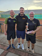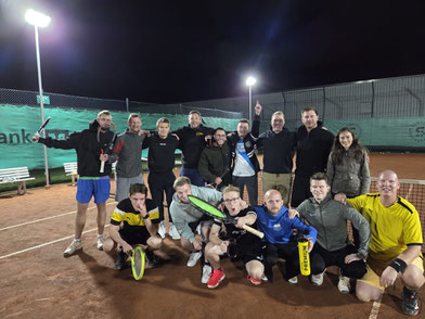 Insgesamt 16 Teilnehmer – darunter auch Martina Schuster, die sich mutig unter die Männer mischte und manchen „vom Platz fegte“ , Kalli Feistl und Peter Sendler, die den Altersdurchschnitt ein wenig anhoben– sorgten für spannende und unterhaltsame Begegnungen. Bei bestem Spätsommerwetter ging es bis spät in die Nacht auf die Plätze. Dank der umsichtigen Organisation von Gari Schnegelsberg und Marvin Reese lief alles reibungslos ab. Das Finale zwischen Steffen Lauritis und Noah Timmermann 3:0 konnte schließlich kurz vor Mitternacht unter Flutlicht auf Platz 1 stattfinden, was für eine besondere Atmosphäre sorgte. Am Ende sicherten sich in der A-Runde Steffen Lauritis und Alessandro Vogelsang gegen Marvin Reese den Sieg im B-Finale. „Insgesamt ein wunderbares Turnier, welches im nächsten Jahr hoffentlich wieder stattfindet,“ schwärmen Marvin und Armin.