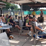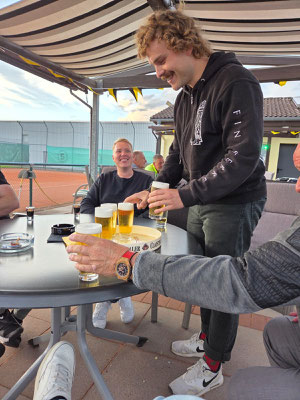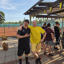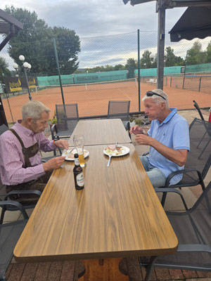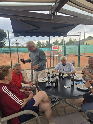 Ab 18:30 Uhr wurde es dann auch sportlich: Auf unserem "CentreCourt" stand ein Meisterschaftsspiel auf dem Programm. Die Paarung: Rainer Schwiete, frischgebackener Nordliga-Meister, gut 30 Jahre erfahrener und Gari Schnegelsberg – jung, ehrgeizig und an diesem Tag einfach in Topform lieferten sich ein intensives Match, das Gari mit 6:1, 6:3 für sich entscheiden konnte. Glückwunsch!
