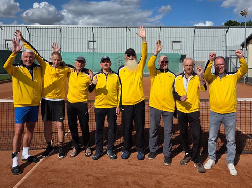 Unsere Herren 65 führen nach drei Siegen die Tabelle Nordliga an. Nach zwei ungefährdeten Siegen in den Heimspielen gegen TK Nordenham (8:1) und TSG Scharbeutz (9:0) erkämpften die Schwarz-Gelben beim TC Condor in Hamburg in einer äußerst spannenden Begegnung einen knappen 5:4-Erfolg. Sie zeigten dabei eine geschlossene Mannschaftsleistung, bei der Alois Hüser mit zwei Siegen herausragte.