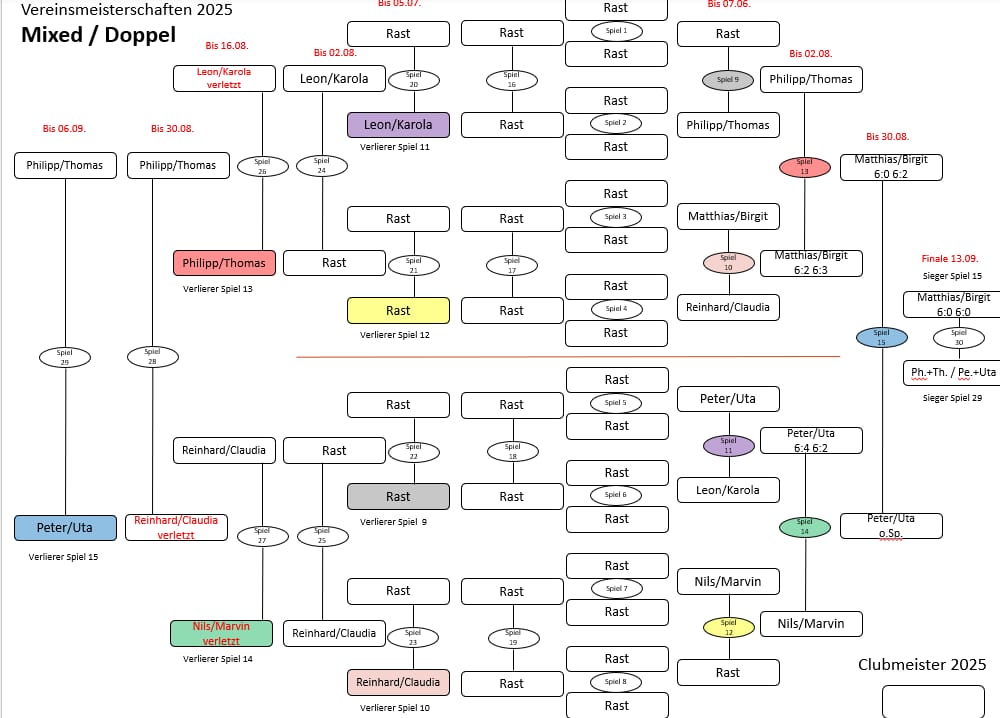 Den Abschluss bildet am Montag, 29.09.um 17.00 Uhr das Mixed-Finale: Birgit Polz-Eckhardt/Matthias Henning gegen Philipp Spellerberg/Thomas Rojahn.Bereits in der Vorrunde standen sich die Teams gegenüber, damals mit einem klaren 6:0, 6:2.