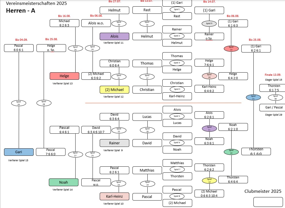 Drei Finals, drei Termine – und jede Menge Spannung: Die diesjährigen Vereinsmeisterschaften laufen unter dem Motto „Endspiel-Trilogie“. Was nach Kino klingt, hat seinen Grund: In diesem Jahr war der Wurm drin, und so mussten Spielplan und Organisation mehrfach flexibel angepasst werden. Herausgekommen ist am Ende eine bunte Mischung aus hochklassigem Tennis, spannenden Premieren und sogar einem spontanen „Unterhaltungsdoppel“.