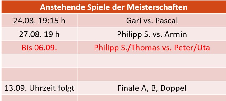 Am Freitag, 19.09. 16.30h geht es weiter mit dem B-Finale im Herren-Einzel, wenn Armin König, Neuzugang aus der „Albaxer-Fußballriege“ seine erste Vereinsmeisterschaft gegen Olli Reese Mitstreiter in der neu gegründeten Herrenmannschaft spielt.. Auf dem Papier vielleicht eine klare Angelegenheit, doch bekanntlich haben ja Endspiele ihre eigenen Gesetze. .. .